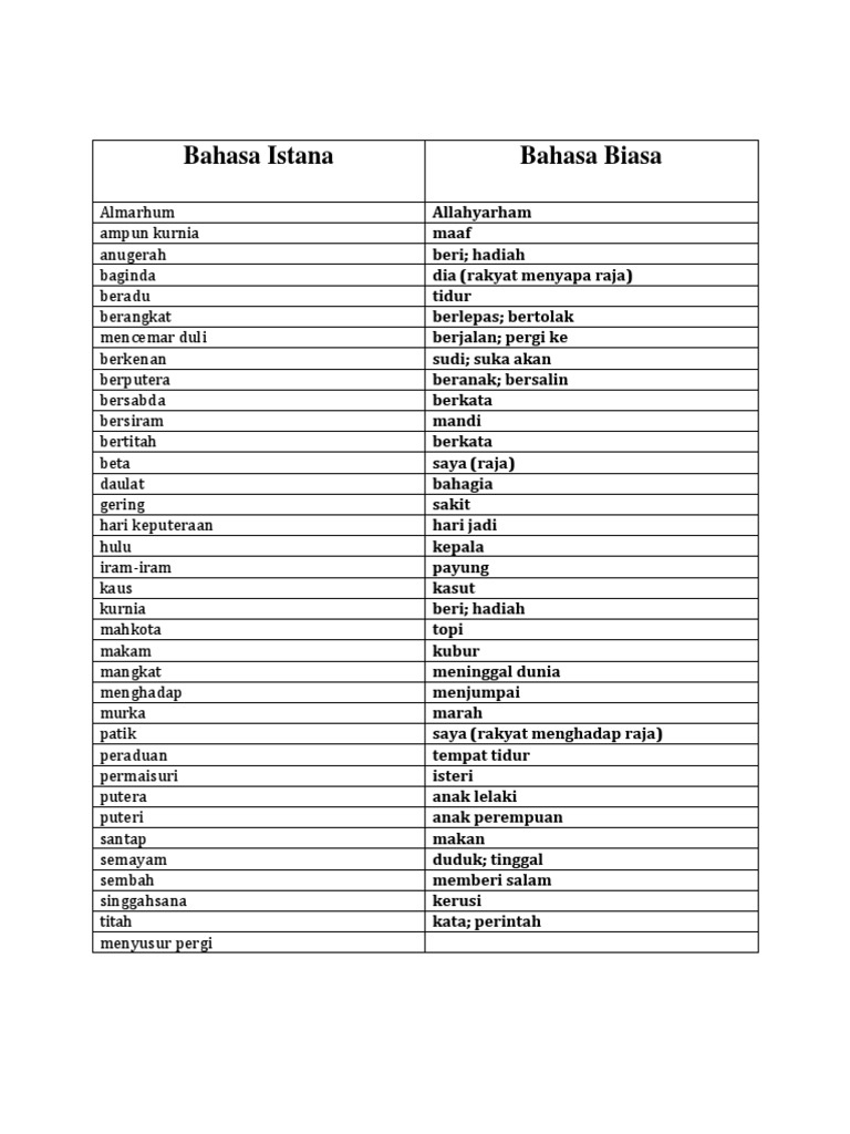 Patik menjunjung kasih kerana anugerah tuanku kpd patik. Berbanyak-banyak dgn bilangan yg banyak. Up to 24 cash back Bahasa Istana Maksud Bahasa Istana 1Mencemar duli Sudi datang Digunakan pada sultan atau raja 2Merafak sembah Mengangkat sembah 3Menjunjung duli Memberi khidmat kepada raja sangat menghargai 4Menjunjung titah Mematuhi menurut 5Menitahkan Memerintah menyuruh 6.