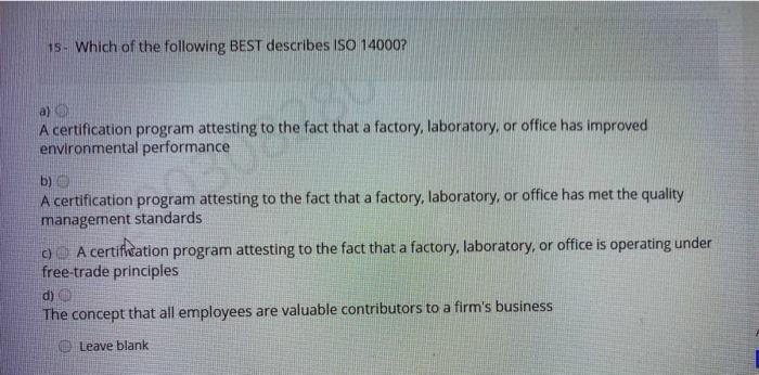 Solved 15 Which Of The Following Best Describes Iso 14000 Chegg Com